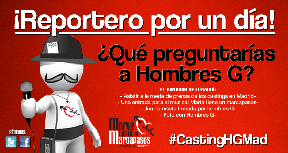 Sí  lo has oído bien ¡Hombres G! El día 5 de marzo es la rueda de prensa con motivo del casting en Madrid para el musical «Marta tiene un Marcapasos» y tú si quieres tienes una oportunidad para asistir, participar en este concurso que han organizado.