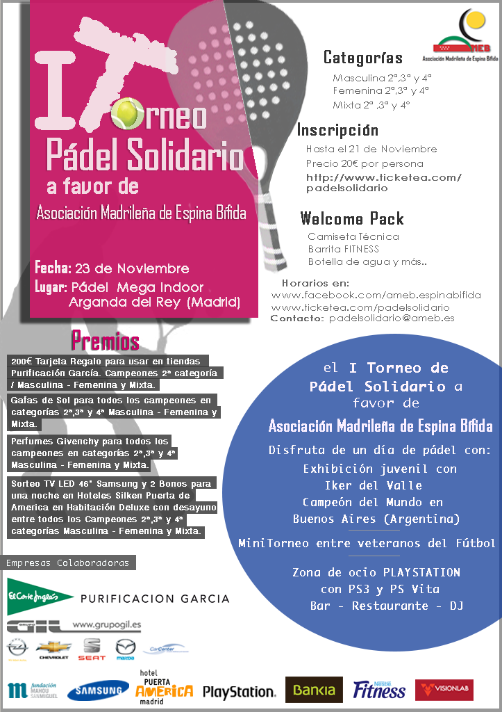 Este sábado 23 de Noviembre, coincidiendo con el Día Nacional de Espina Bífida, tendrá lugar el El I TORNEO DE PÁDEL SOLIDARIO AMEB (Asociación Madrileña de Espina Bífida) 2013 en las instalaciones Pádel Mega Indoor de Arganda del Rey, Madrid.